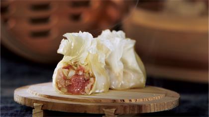 一籠燒麥稱(chēng)一兩, 一壺磚茶涮肚腸; 皮薄餡大滋味足, 油煎熱蒸鮮嫩香。